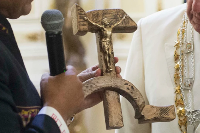 Según informó la prensa, se trata de una réplica de una talla hecha por el sacerdote Luis Espinal Camps, jesuita asesinado en 1980 y por quien rezó ayer en la tarde el Pontífice en su camino hacia La Paz proveniente del aeropuerto de El Alto.