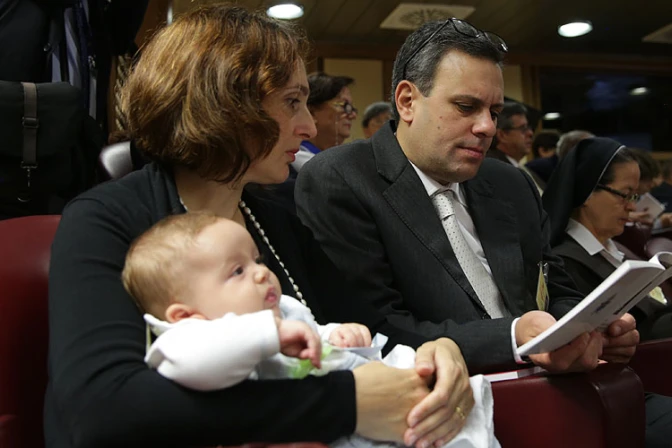 Cada mañana, el matrimonio acude al Aula Nueva del Sínodo para participar de las sesiones llevando en el carrito a Davide. Allí, el primer día solo lloró una vez, cuentan a ACI Prensa sus padres, "y yo salí rápidamente de la sala para atenderle".