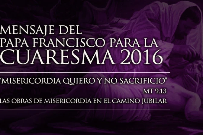 El mensaje del Papa Francisco para la Cuaresma 2016 lleva como título «'Misericordia quiero y no sacrificio' (Mt 9,13). Las obras de misericordia en el camino jubilar». El texto ha sido dado a conocer por la Santa Sede en conferencia de prensa. Los idiomas en los que puede encontrarse son el italiano, español, inglés, polaco, alemán, portugues, francés y árabe.
