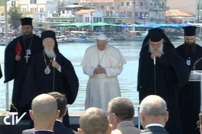 Tras su encuentro con la población y la comunidad católica en el Puerto de Mitilene en Lesbos; el Papa Francisco, el Patriarca Ecuménico Bartolomé y el Arzobispo de Atenas y de Toda Grecia Jerónimo, rezaron cada uno una breve oración individual por las víctimas de las migraciones.