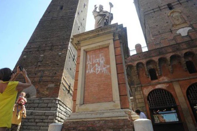 La estatua de San Petronio, patrón de la ciudad de Bolonia (Italia), se encuentra en la plaza 'di Porta Ravegnana', justo debajo de Las Dos Torres. Este emblemático monumento ha amanecido con una inscripción en árabe. La frase "Alá Akbar", que significa "Dios es grande", ha ocupado en gran medida la base de la escultura.