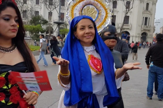 Ayer, en la marcha del orgullo gay de Lima (Perú), una mujer se burló de la Virgen María, repartiendo "bendiciones" pic.twitter.com/FuiEKNYyo0