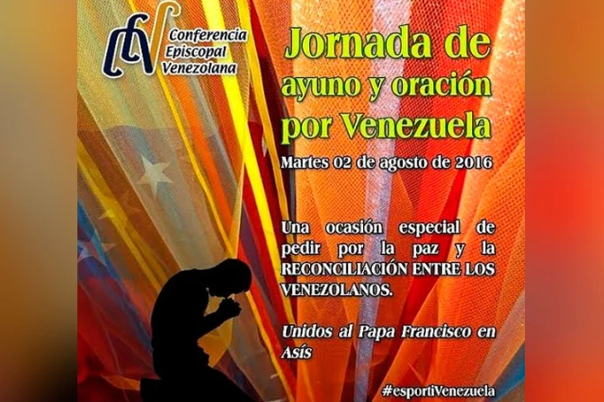 La Conferencia Episcopal Venezolana (CEV), invitó a la población a participar mañana 2 de agosto en la Jornada de Oración y Ayuno por la paz y reconciliación del país, promoviéndola además en las redes sociales con el hashtag #esportiVenezuela.