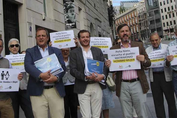 Miembros de la asociación HazteOir.org han entregado esta mañana 170.000 firmas en la Embajada de México en Madrid exigiendo al presidente Peña Nieto que respete el matrimonio y el derecho de los padres a educar a sus hijos según sus convicciones.