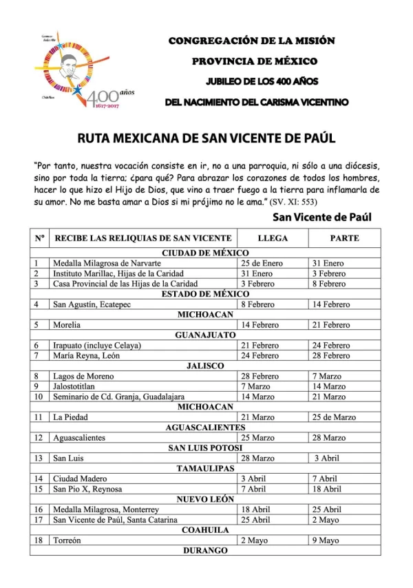 En el marco del Jubileo por los 400 años del nacimiento de la Familia Vicenciana, una reliquia de primer grado de su fundador, San Vicente de Paúl, está recorriendo diferentes ciudades de México para su veneración pública.