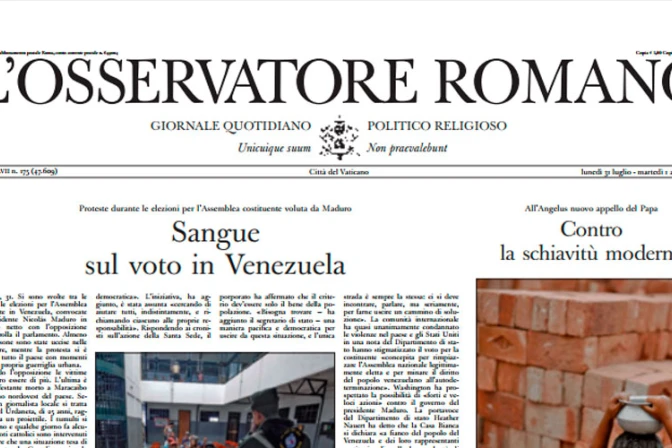 El diario de la Santa Sede, L'Osservatore Romano, denunció en primera plana la jornada violenta que vivió ayer Venezuela, que dejó entre 10 a 15 muertos durante las elecciones de la Asamblea Nacional Constituyente impulsada por el Gobierno de Nicolás Maduro.