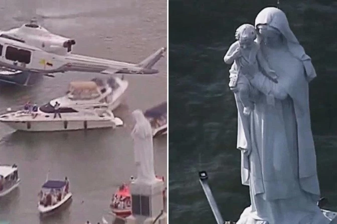 El helicóptero que trasladaba al Pontífice pasó sobre esta imagen de María con el niño en brazos, que estaba rodeada por varias embarcaciones.