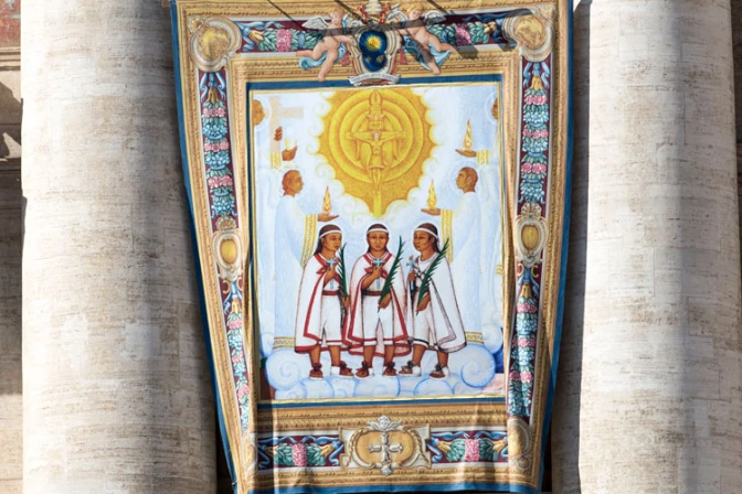 La Plaza de San Pedro del Vaticano luce ya engalanada para la ceremonia de canonización, este domingo 15 de octubre, de Cristóbal, Antonio y Juan, los "Niños Mártires de Tlaxcala", asesinados por odio a la fe en México entre 1527 y 1529.