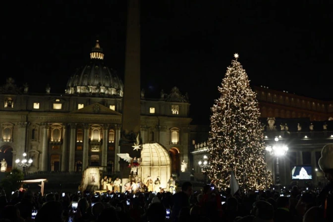 Desde las 4:30 p.m. (hora local), los peregrinos y visitantes que se acerquen hasta el Vaticano podrán admirar el impresionante árbol de 25 metros de altura traído desde Polonia y decorado por niños enfermos de cáncer, así como el pesebre de estilo napolitano de 80 metros cuadrados de superficie, inspirado en las obras de misericordia.