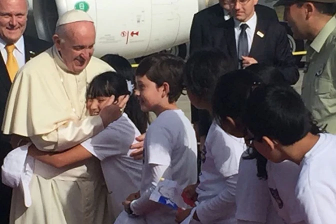 El Papa Francisco aterrizó a eso de las 9 a.m. en el Aeródromo de Temuco y fue recibido por autoridades locales y unos niños mapuches a quien el Papa los abrazó y saludó.
