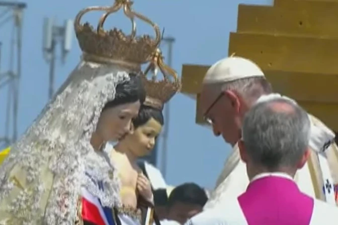 Durante la Eucaristía, una pareja de jóvenes, que realizan los bailes tradicionales dedicados a esa advocación, le presentaron al Papa dos coronas, una para la Virgen y otra para el Niño Jesús que lleva en brazos. Tras bendecirlas, el Pontífice caminó hacia la imagen y coronó a ambos.