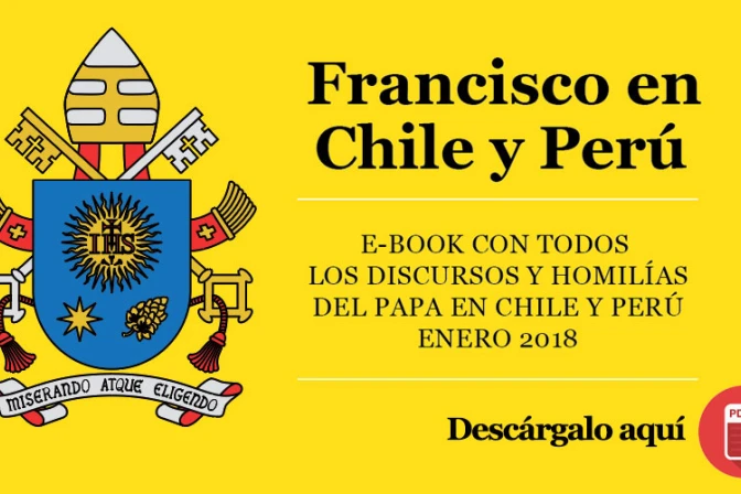 ACI Prensa ofrece a sus lectores un e-book en PDF, ePub y Mobi (para dispositivos Kindle) con todas las homilías, oraciones y discursos del Papa Francisco en Chile y Perú en ocasión de su visita pastoral realizada, respectivamente, del 15 al 18; y del 18 al 21 de enero.