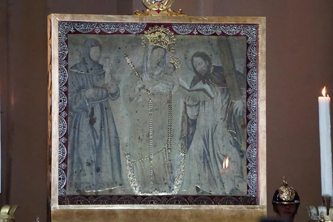Hace cuatrocientos años, el español Alonso de Narváez pintó la imagen de la Virgen del Rosario junto al Apóstol San Andrés y a San Antonio de Padua, en una manta de algodón de más de un metro.