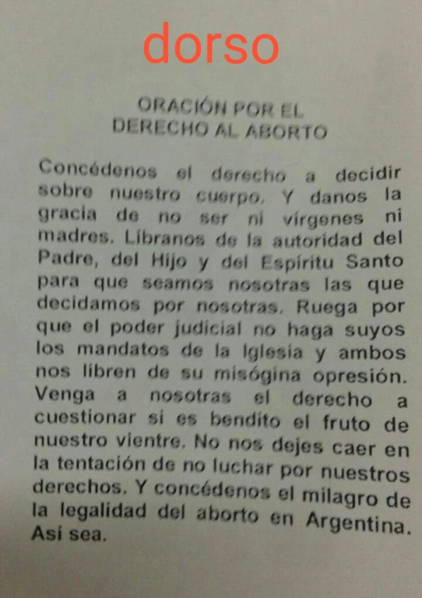 "Concédenos el derecho a decidir sobre nuestro cuerpo.?Y danos la gracia de no ser ni vírgenes ni madres. ?Líbranos de la autoridad del Padre, del Hijo y del Espíritu Santo para que seamos nosotras las que decidamos por nosotras. ?Ruega porque el poder judicial no haga suyos los mandatos de la Iglesia y ambos nos libren de la misógina opresión.? Venga a nosotros el derecho a cuestionar si es bendito el fruto de nuestro vientre.? No nos dejes caer en la tentación de no luchar por nuestros derechos.? Y concédenos el milagro de la legalidad del aborto en Argentina.? Así sea", describe el texto.