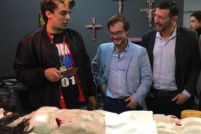 Una torta tamaño real del cuerpo de Jesús muerto expuesta en la Feria de Arte Contemporáneo Argentina (FACA) el jueves 24, causó un amplio rechazo en las redes sociales, sobre todo porque el ministro de Cultura de la ciudad de Buenos Aires (Argentina), Enrique Avogadro, aparece en un video comiendo una porción del pastel.