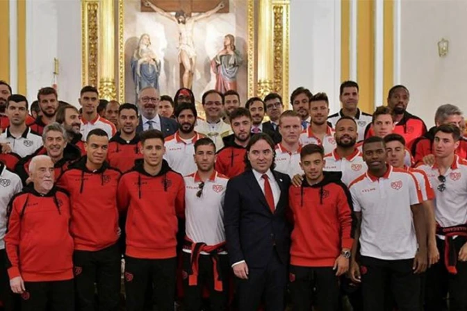 El club de fútbol Rayo Vallecano visitó la parroquia de San Ramón Nonato en el barrio de Vallecas, Madrid (España) para ofrecer a la Virgen del Carmen su ascenso a la Primera División de la Liga de fútbol española.