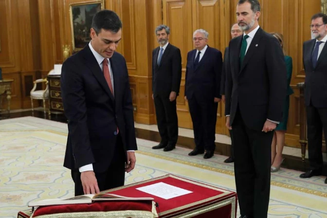 El nuevo presidente de gobierno de España, Pedro Sánchez, prometió el cargo hoy frente a la Constitución y junto al rey Felipe VI pero sin crucifijo ni Biblia, algo sin precedentes en la historia democrática moderna del país.