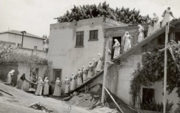 Misioneras Clarisas participan en la construcción de uno de los edificios de su Casa Madre, a mediados del siglo XX. Foto: Cortesía Misioneras Clarisas.