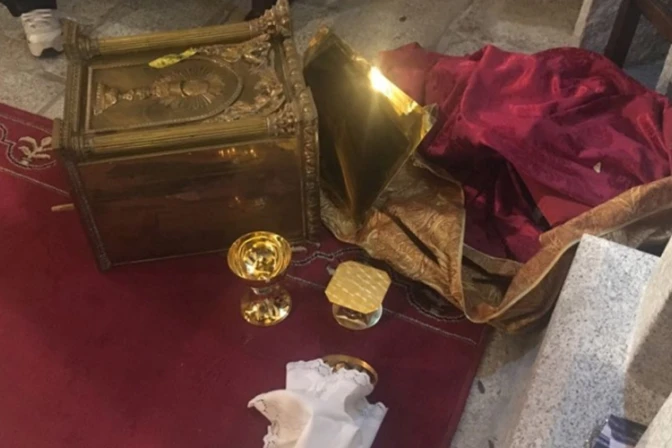 Los asaltantes volcaron el copón con las formas sagradas que quedaron esparcidas y también tiraron los cálices y vasos sagrados.