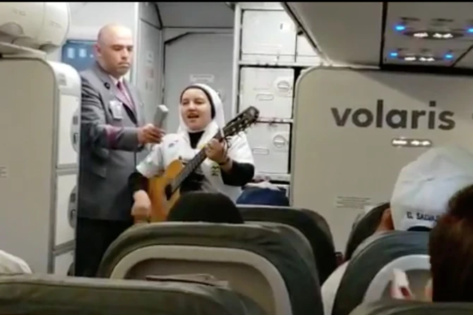 Una religiosa con guitarra en mano entonó alegres cantos durante el viaje en avión que un grupo peregrinos hizo rumbo a la Jornada Mundial de la Juventud en Panamá (JMJ) 2019 que comienza este martes 22.