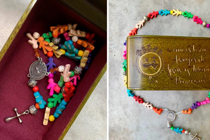 En sus manos portaban una caja de madera grabada con el logo del ministerio "Amigos de Jesús y María". En su interior había un bello rosario de colores cuyas cuentas tienen forma de niños que representan los cinco continentes.