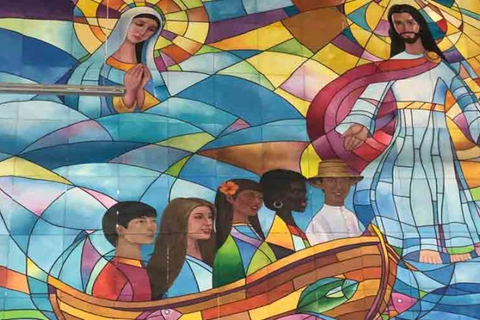Este mural muestra una barca con cinco jóvenes navegando hacia Jesús en medio del mar lleno de peces y en el fondo se encuentra la Virgen María complacida por el encuentro.