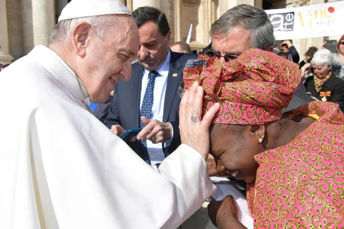 Después de la Audiencia General, el Papa Francisco bendijo a Augusta, una de las jóvenes protagonistas del documental "Love" en donde se denuncia la explotación sexual; le acompañaba el misionero salesiano Jorge Crisafulli, director de la obra de Freetown (Sierra Leona).