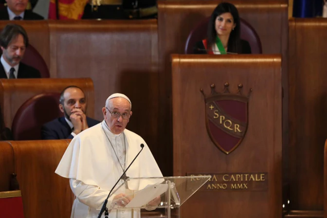 Durante su discurso pronunciado en el aula Julio Cesar a la asamblea del Ayuntamiento, el Santo Padre aseguró que "la Santa Sede desea colaborar cada vez más y mejor por el bien de la ciudad, al servicio de todos, especialmente de los más pobres y desfavorecidos, por la cultura del encuentro y por una ecología integral".