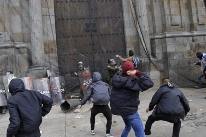 Una turba de vándalos atacó la Catedral Primada de Bogotá en Colombia el jueves 25 de abril por la tarde, dejando una gran cantidad de daños materiales.