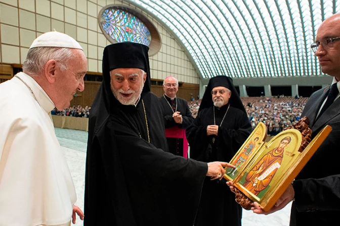 En su discurso a los visitantes de la eparquía, el Papa Francisco recordó que "hace cien años, mientras el mundo estaba desgarrado por la Primera Guerra Mundial", el Papa Benedicto XVI "escuchó su historia, sus necesidades legítimas, así como su valiente viaje espiritual, caracterizado por la fidelidad a la tradición, a pesar de las dificultades y sufrimiento".