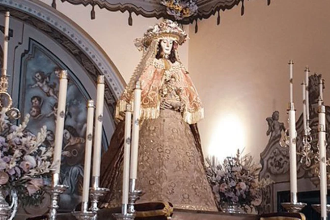 La Virgen del Rocío, también conocida como la Blanca Paloma, estará en esta parroquia hasta dos semanas antes de su romería, cuando será de nuevo trasladada a su santuario a las afueras de Almonte.
