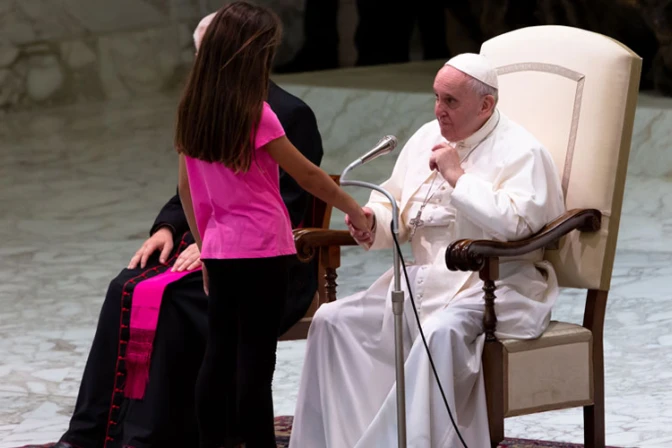 Durante la Audiencia General celebrada este miércoles 21 de agosto en el Aula Pablo VI del Vaticano, una niña con una enfermedad subió de forma espontánea las gradas desde donde estaba hablando el Papa Francisco e interrumpió su catequesis.