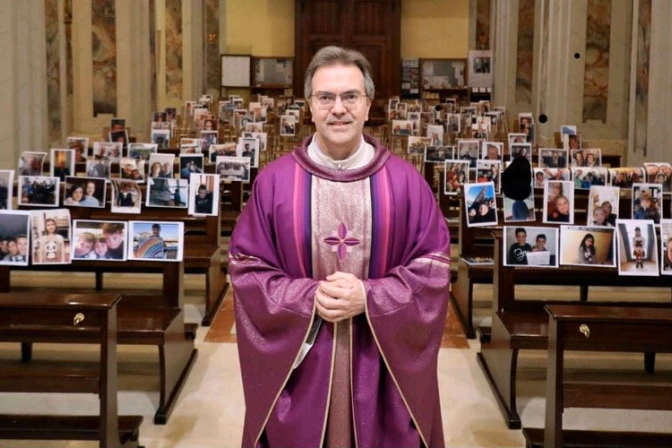 "Esta idea surgió debido a una necesidad personal: tener que celebrar la Misa solo fue algo bastante triste, incluso si la Misa tiene su propia eficacia. Entonces, les pedí a mis feligreses que me dieran una foto, un selfie de ellos y luego las imprimí y las pegué en los bancos y en los asientos de esta maravillosa iglesia", explicó.