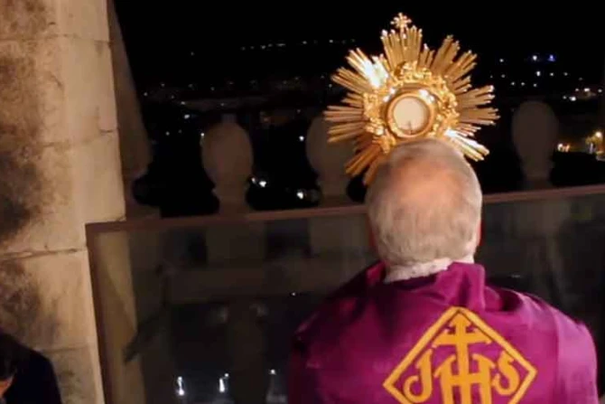 Ante la "situación límite" de la pandemia del coronavirus COVID-19, el Obispo de Alcalá de Henares, Mons. Juan Antonio Reig Pla, hizo una oración y bendijo su diócesis con el Santísimo Sacramento desde el campanario de la Catedral.