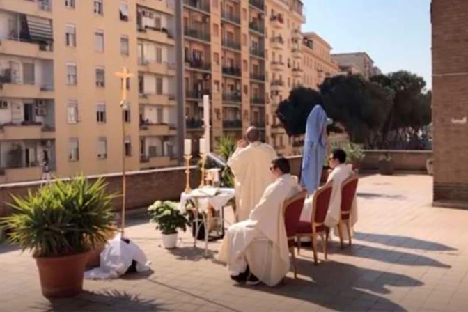 Un sacerdote de Roma celebró la Misa de Pascua desde el techo de la iglesia para que los fieles que viven cerca pudieran participar desde sus balcones y ventanas durante la cuarentena por el coronavirus en Italia.