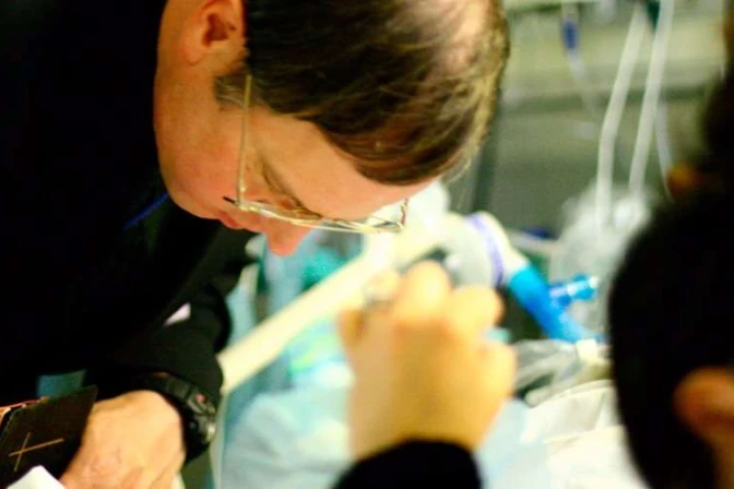 El sacerdote vestido con EPP está parado fuera de la habitación de hospital de un paciente con COVID-19, dice las palabras del ritual de la Unción a través del altavoz, pero son las palabras de Cristo, señaló el P. Macdonald. Luego, ingresa al cuarto, administra los aceites sagrados con un pedazo de algodón y regresa a su puesto inicial, pero es Cristo quien atraviesa la puerta cerrada y es quien permanece con el enfermo, añadió.