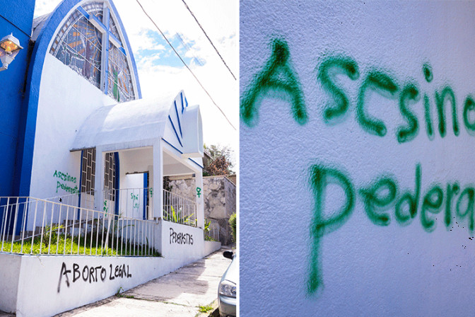 Sobre los muros de los templos se pueden leer frases como: "Saquen sus rosarios de nuestros ovarios", "será ley", "enójate hermana", "no más feminicidios", "aborto legal será", "pederastas", "asesinos pederastas".