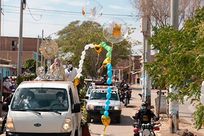 Según informa el Arzobispado de Piura, el recorrido se inició en la mañana de hoy en el Palacio Arzobispal, con Mons. Eguren portando la custodia con el Santísimo Sacramento sobre un camión, escoltado por varias unidades de la policía nacional.