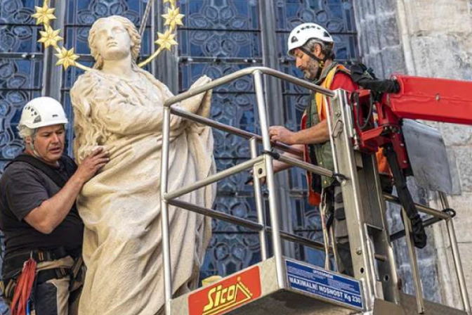 La réplica se logró gracias al esfuerzo de una asociación de historiadores, artistas y católicos que trabajaron por más de 30 años para recrear la imagen y obtener el permiso de la ciudad para devolver la columna mariana a su lugar histórico.