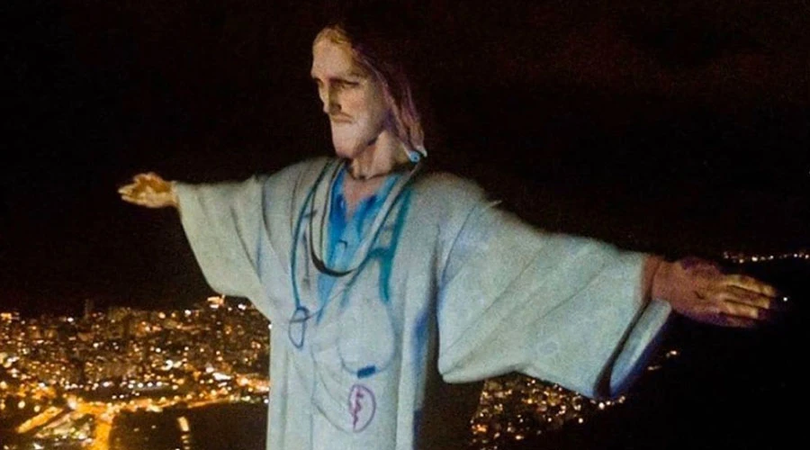 El Domingo de Resurrección, 12 de abril, el Cristo Redentor fue "vestido" con el uniforme de los médicos del país, como un homenaje al personal de salud que lucha para detener al coronavirus.