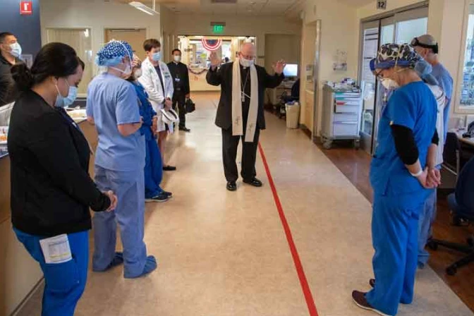 On Friday morning, Bishop of Orange Kevin Vann (@OCBishop) visited and blessed the patients and health care workers at @StJosephOrange. The Bishop offered a prayer which was broadcast throughout the hospital. #OCCatholic pic.twitter.com/7x36gF2bd7