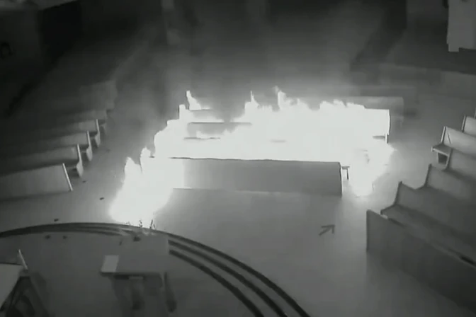 El video de vigilancia de la iglesia, que captó el incidente, muestra cómo el joven huye del lugar cuando las llamas estallaron, aparentemente sin robar nada.