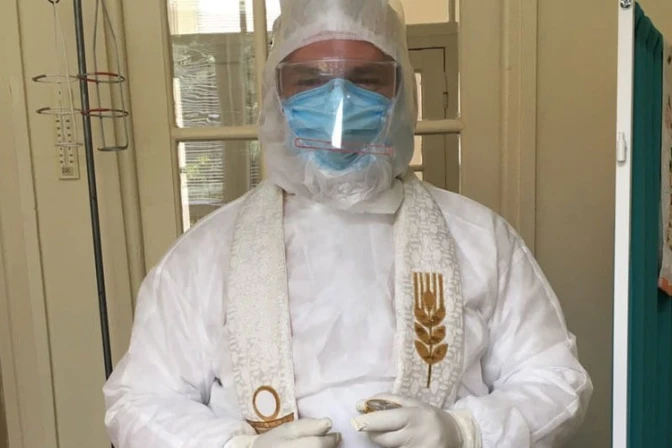 En el hospital, siempre sobre el traje de protección, el P. Grzegorz se pone la estola que "simboliza, con toda su fuerza, la vocación del sacerdote: pastor que si es necesario lleva a sus ovejas sobre sus hombros y guía que conduce a las almas hacia la vida eterna", apuntan desde esta fundación pontificia.