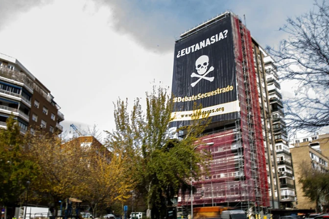 La iniciativa "Vividores" desplegó una enorme lona contra la eutanasia en el centro de Madrid (España). Con esta acción, junto con la pega de carteles, recuerdan que el Gobierno de España quiere aprobar la ley de despenalización de la eutanasia sin debate y sin demanda social.