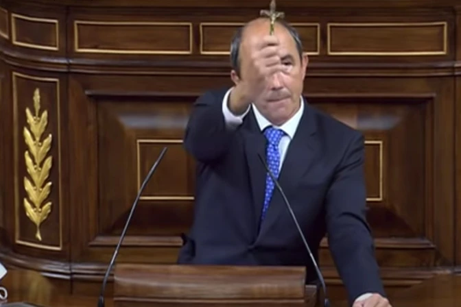 Francisco José Contreras mostró en el Congreso de los Diputados de España el crucifijo que llevaba en el pecho su tío abuelo, el P. Rafael Contreras Leva, antes de morir despedazado con un hacha en Baena, Córdoba (España) durante la persecución religiosa de la Guerra Civil.