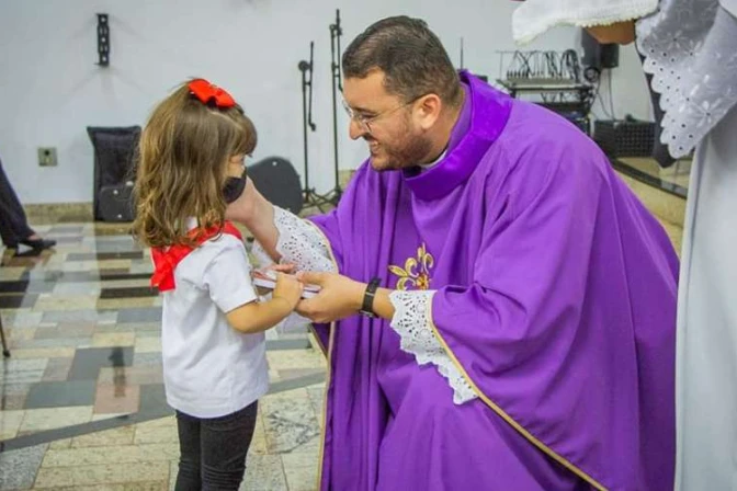 Junto a la pequeña Ana, su padre, Fábio Aparecido Marins, también recibió la cinta del Apostolado de la Oración.