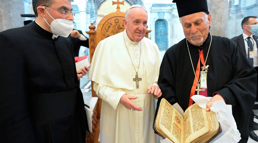 En su estadía en el país, el Pontífice se reunió en la Catedral católica siria de Nuestra Señora de la Salvación, en Bagdad con obispos, sacerdotes, religiosos y religiosas, seminaristas y catequistas a los que recordó que la Cruz transmite un "mensaje salvífico de perdón, reconciliación y resurrección".
