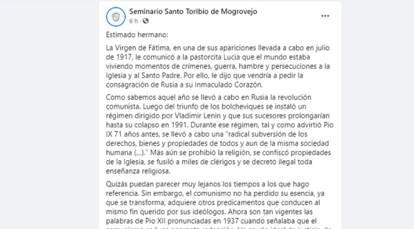 La publicación eliminada recordaba también el pedido de la Virgen de Fátima en 1917 de consagrar a Rusia a su Inmaculado Corazón ante la amenaza del comunismo.