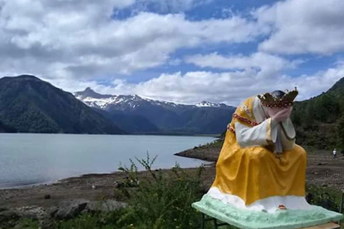 En un día frío y con lluvia, los fieles de la parroquia Sagrada Familia de la localidad de Hornopirén peregrinaron hacia el santuario ubicado en el Lago Cabrera, entre los volcanes inactivos Yates y Hornopirén.
