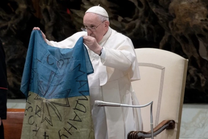 En esta línea, el Papa mostró y besó una bandera que recibió de Ucrania, saludó a un grupo de niños con algunas madres de Ucrania que acaban de llegar a Italia y dijo "son víctimas cuya sangre inocente clama al cielo e implora, pongamos fin a esta guerra, silenciemos las armas, dejemos de sembrar muerte y destrucción, recemos juntos por esto".